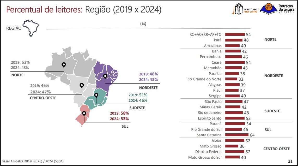 De acordo com a 6ª edição do estudo, a região Norte apresenta apenas 48% no gráfico percentual de leitores, uma queda de 23,8% se comparada a 2019, em que foi exposta uma média de 63%. Levando em conta a leitura parcial ou total de livros em todos os formatos e gêneros.
